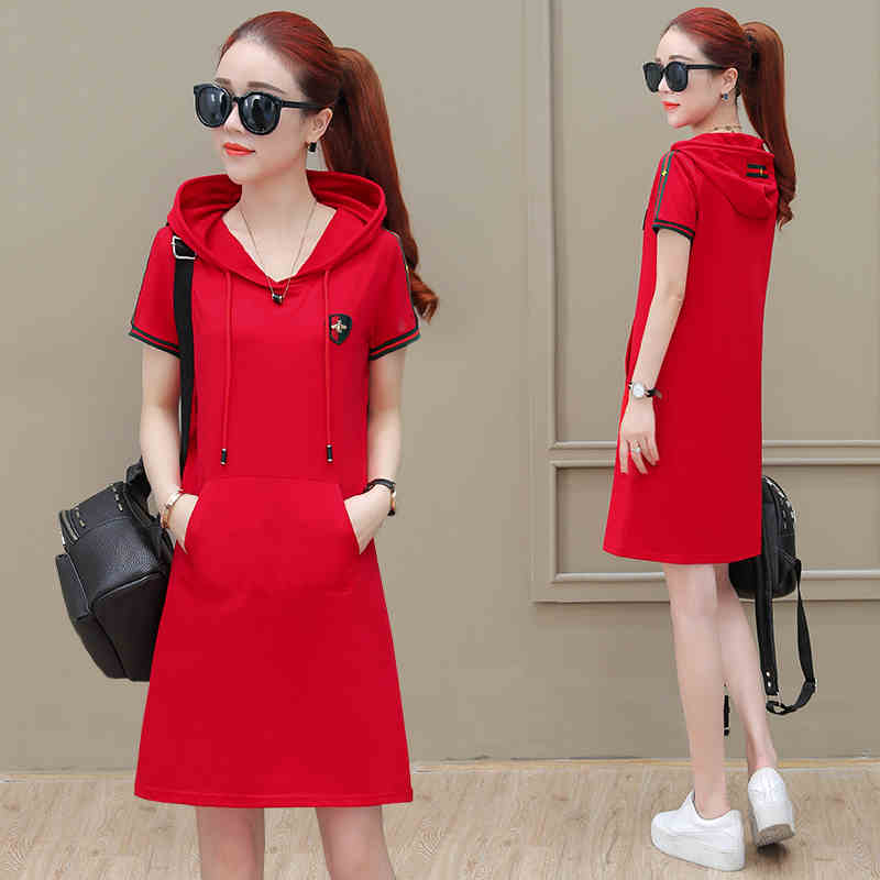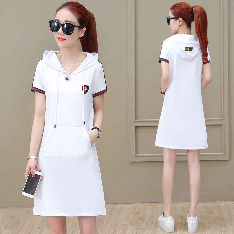 短袖卫衣中长款女夏韩版2018新款连帽运动休闲宽松连衣裙修身...