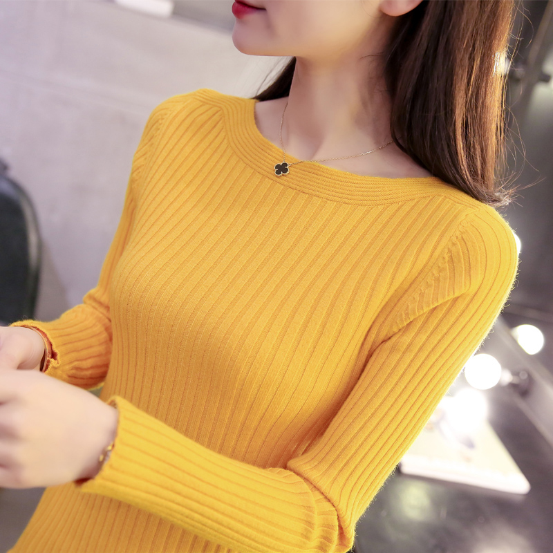 修身一字领针织衫女上衣2018春秋新款纯色长袖打底衫紧身毛衣...