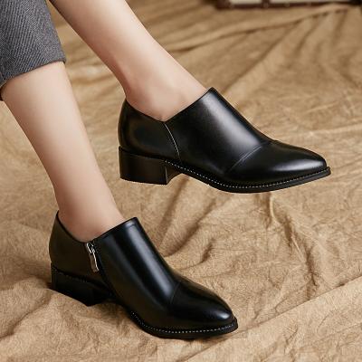 2018春新款真皮尖头皮鞋女粗跟中跟深口单鞋女百搭复古英伦风...