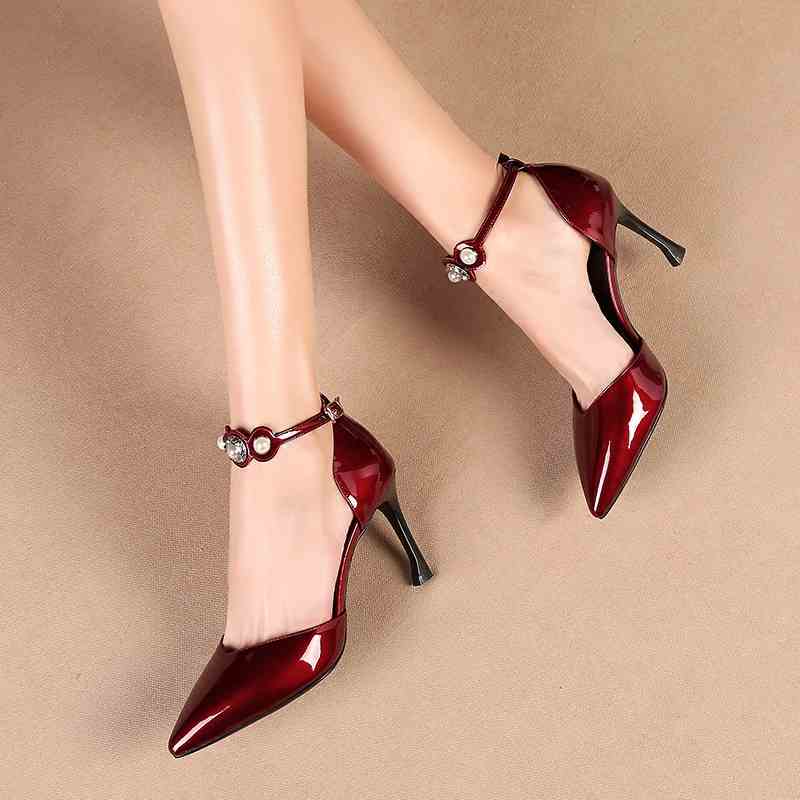 包头凉鞋女细跟2018春季新款性感一字搭扣中空真皮水钻尖头高...
