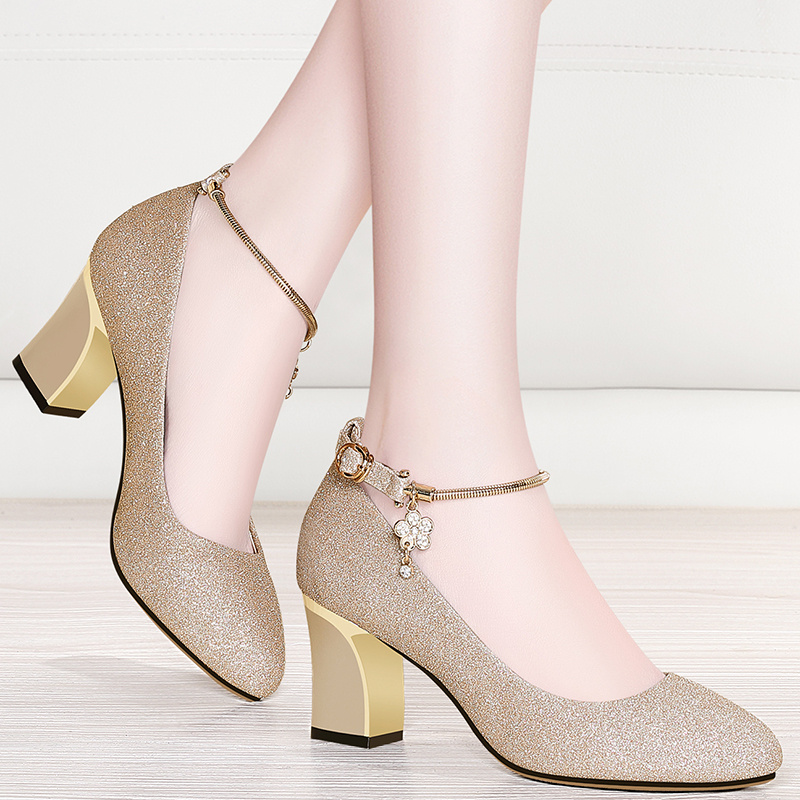 2018春季新款金色皮鞋女士高跟鞋夏季粗跟单鞋韩版尖头百搭工...