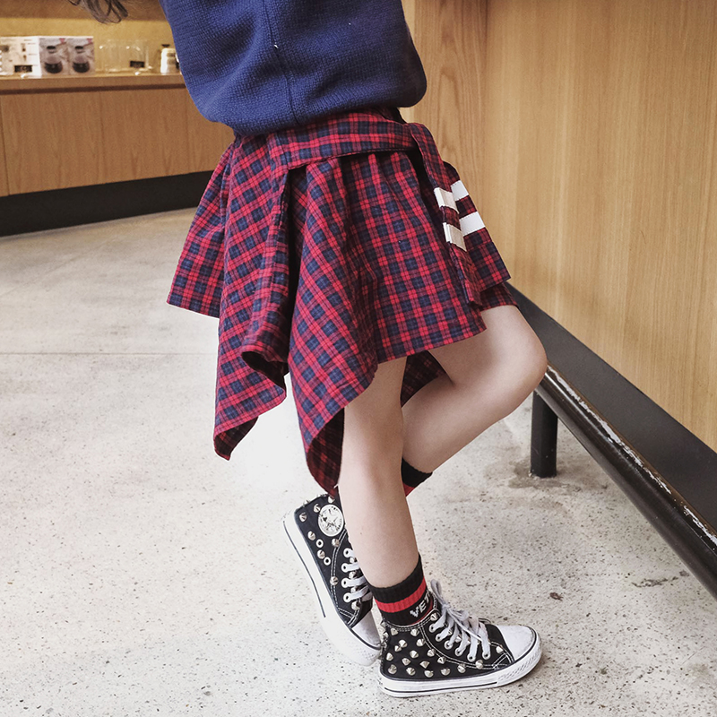 女童半身裙春夏 2018新款韩版童装短裙格子系带字母洋气半身...